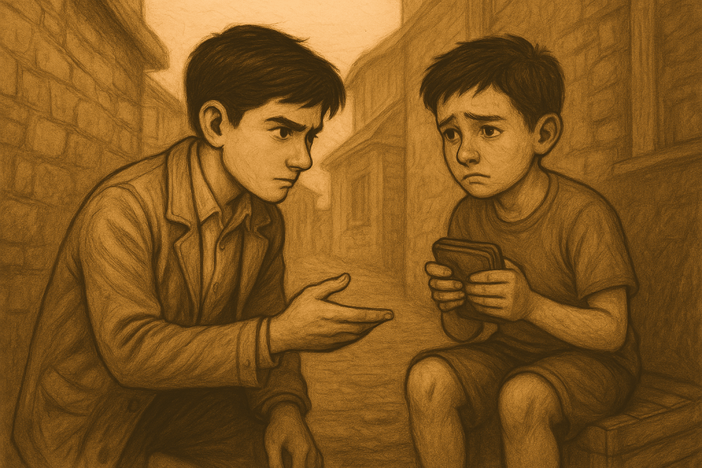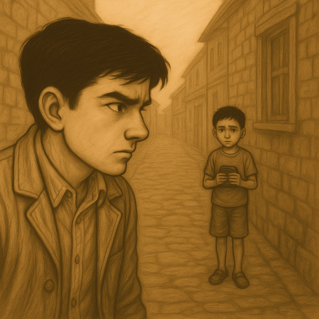 A boy, sitting on an old wooden crate, chewing nervously on his lip. It was Rohan, one of the town’s errand runners. And in his hands—was that…?