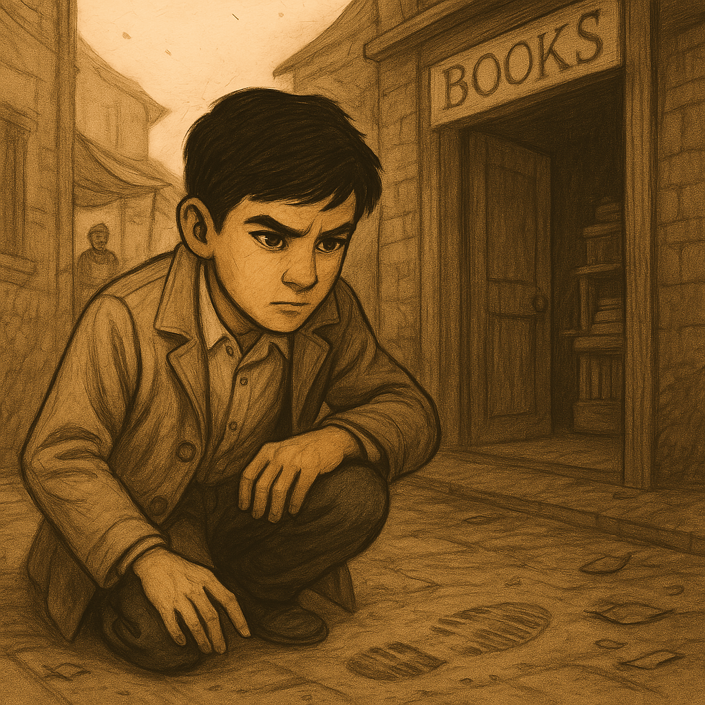 His gaze flicked to the bookstore’s entrance. The ground was dusty, scattered with fallen leaves that stirred gently in the breeze. But then he saw something unusual—a faint scuff mark on the pavement. Someone had made a hurried step, as if rushing away.
