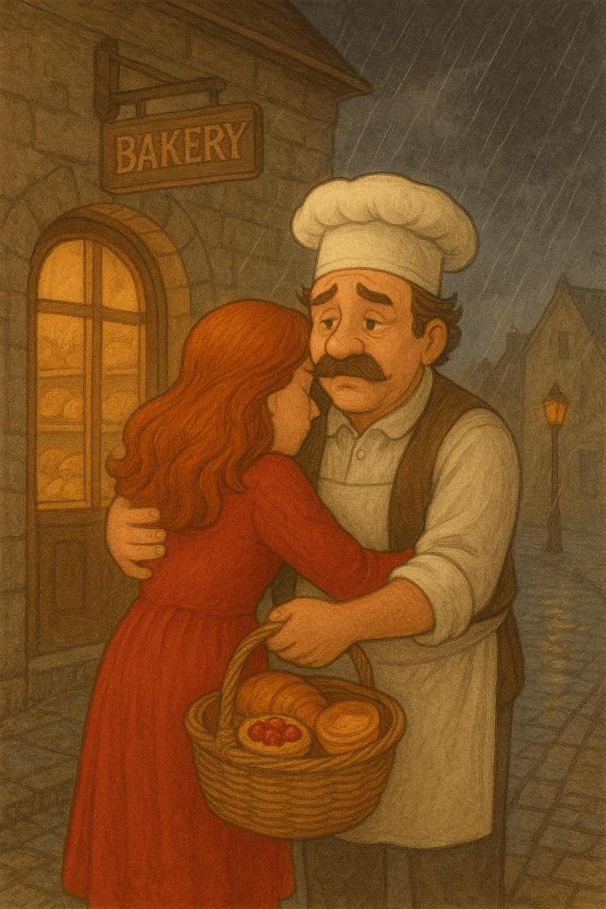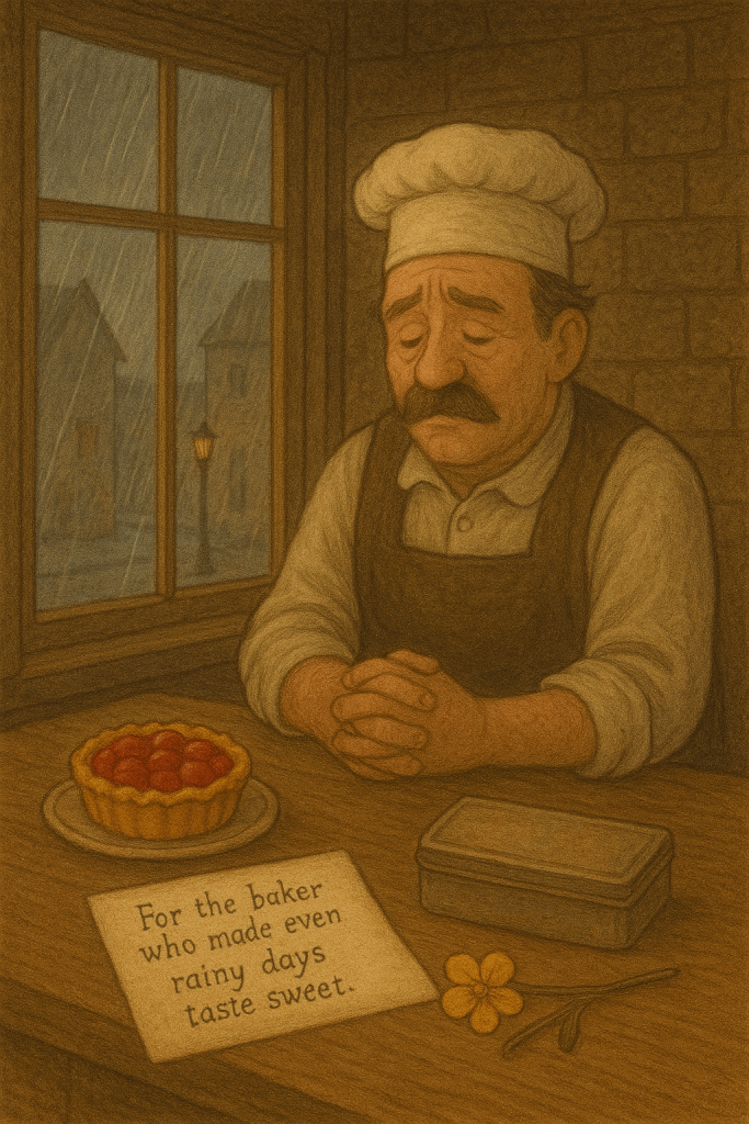 The bakery was never quite the same. Oliver still baked, still gave extra frosting to the children, still argued with Mr. Flint about sugar. But some mornings, he’d place a cherry tart by the window and leave it untouched, as if waiting for a laugh he knew wouldn’t come. Years later, when Oliver passed away quietly in his sleep, the townsfolk found a small tin box under his bed. Inside was a faded ribbon, a pressed buttercup flower, and a note in Clara’s handwriting: “For the baker who made even rainy days taste sweet.”